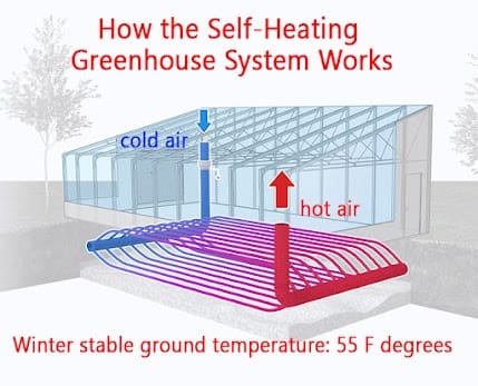 The way you can harness this stable underground temperature is to circulate the air from the greenhouse through underground loop pipes until it warms to almost 55 degrees. The only energy spent is with a very small fan that circulates the air through the tubes.